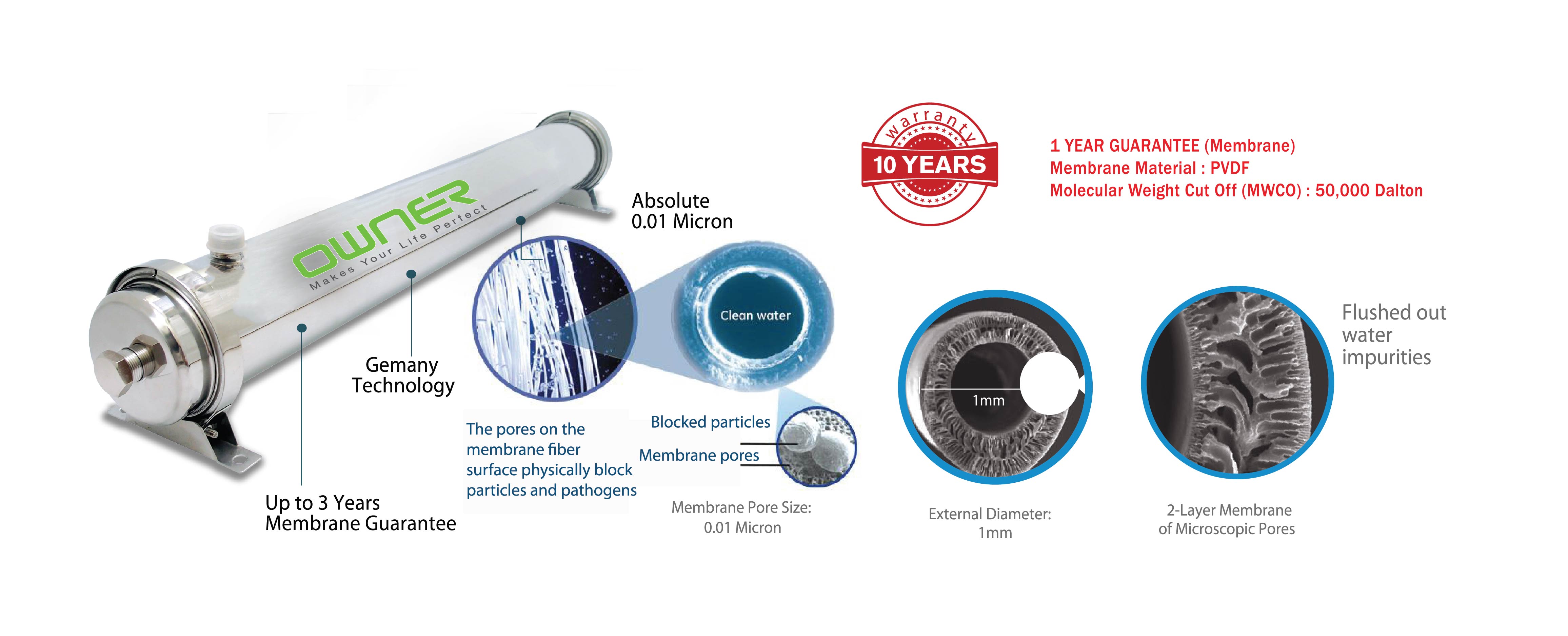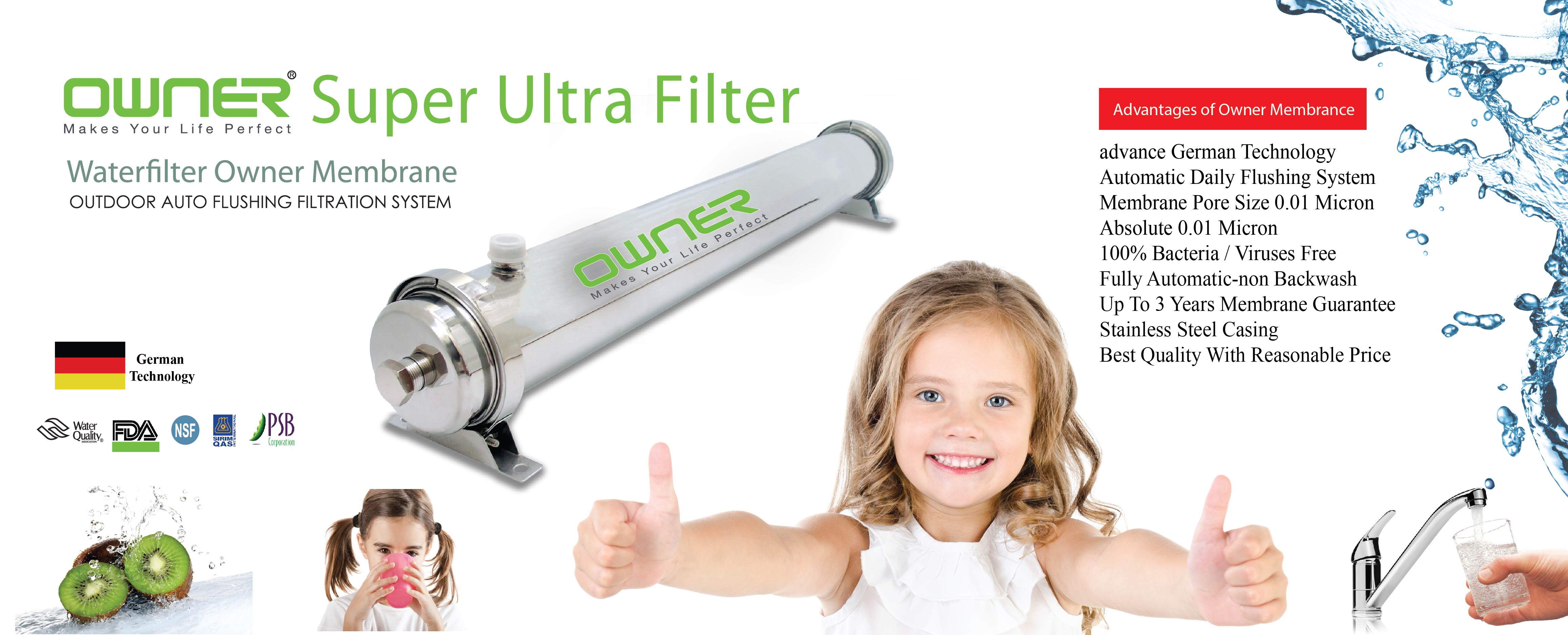 Owner Super Ultra Filter adopted superior membrane technology to provide the cleanest water for whole house with excellent removal of bacteria,viruses,mud and harmful impurities up to 0.01 micron.